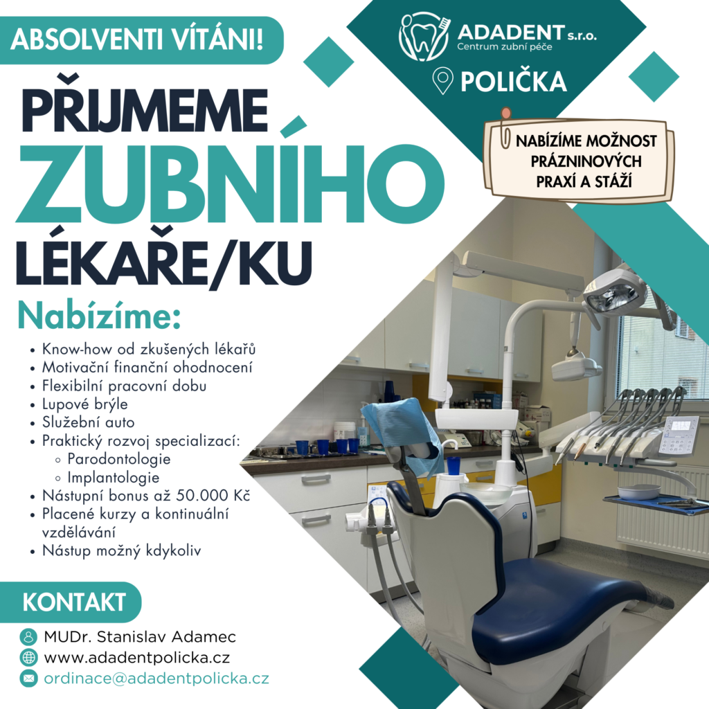 Máte-li zájem o práci v moderním stomatologickém centru se špičkovým zázemí, zašlete Váš životopis na ordinace@adadentpolicka.cz nebo níže vyplňte přihlášku.